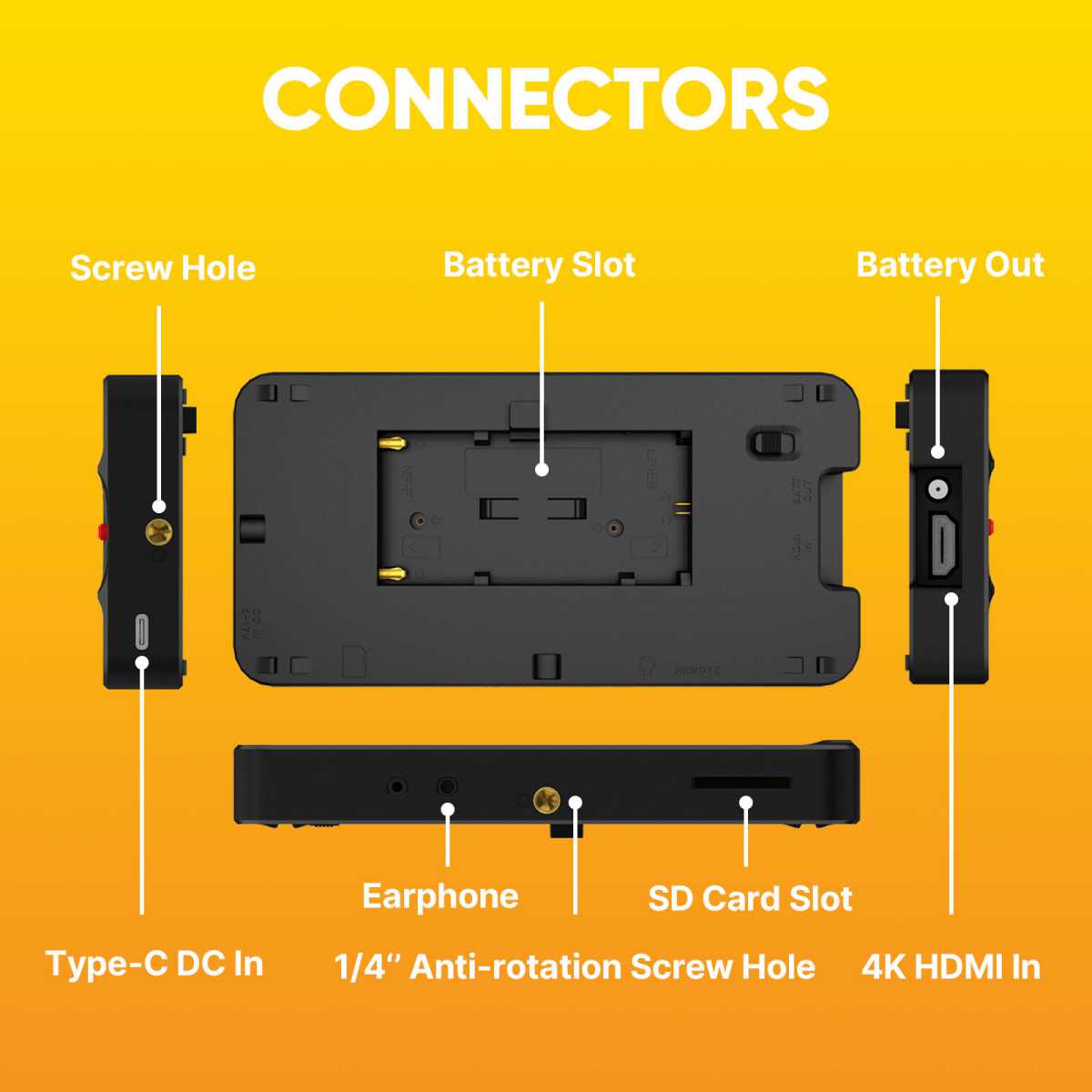 This monitor only weighs 175g without battery and has a size similar with your phone. With a plastic ABS polycarbonate shell and a built-in aluminum sheet, it is not only light but also quite sturdy as well. It also has two metal 1/4” metal screw holes with anti-rotation pin holes, you can attach it on your camera, gimbal, cage… You can fit it into all kinds of setups without loose.